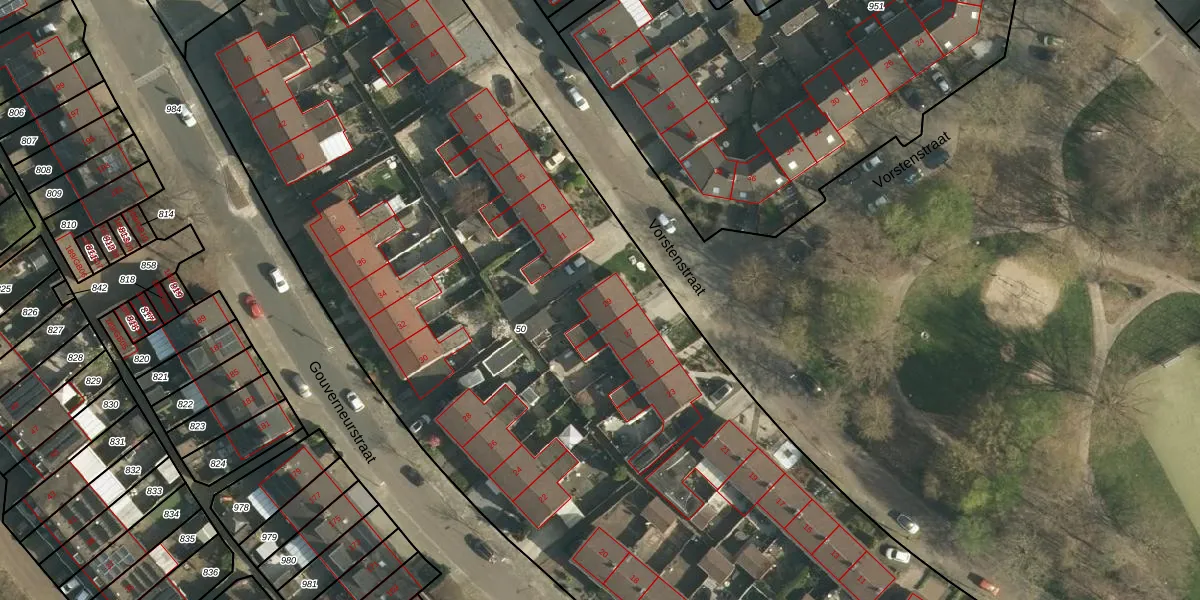 Het perceel waarop Vorstenstraat 29 staat heeft een oppervlakte van 8900 m². Dit is een zeer groot perceel. De perceeloppervlakte wordt geregistreerd door het Kadaster. Gedetailleerde informatie over de maten van dit perceel kunt u vinden in het rapport Kadastrale kaart met maatvoering van Vorstenstraat 29.