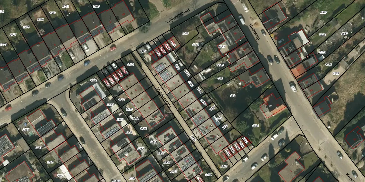 Vredestraat 7 is gelegen op kadastraal perceel HLN01K2432. Deze kadastrale aanduiding is uniek en wordt gebruikt door het Kadaster om eigendomsrechten en andere zakelijke rechten vast te leggen. Het perceel maakt onderdeel uit van de kadastrale gemeente Heerlen.