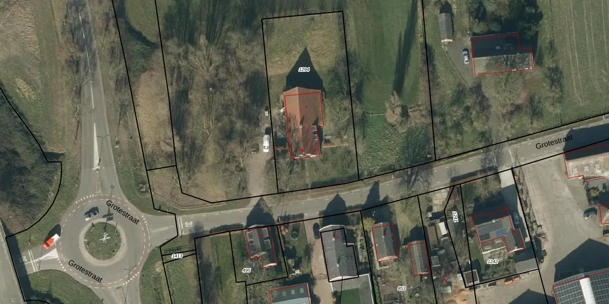 Het perceel waarop Grotestraat 18 staat heeft een oppervlakte van 1520 m². Dit is een zeer groot perceel. De perceeloppervlakte wordt geregistreerd door het Kadaster. Gedetailleerde informatie over de maten van dit perceel kunt u vinden in het rapport Kadastrale kaart met maatvoering van Grotestraat 18.