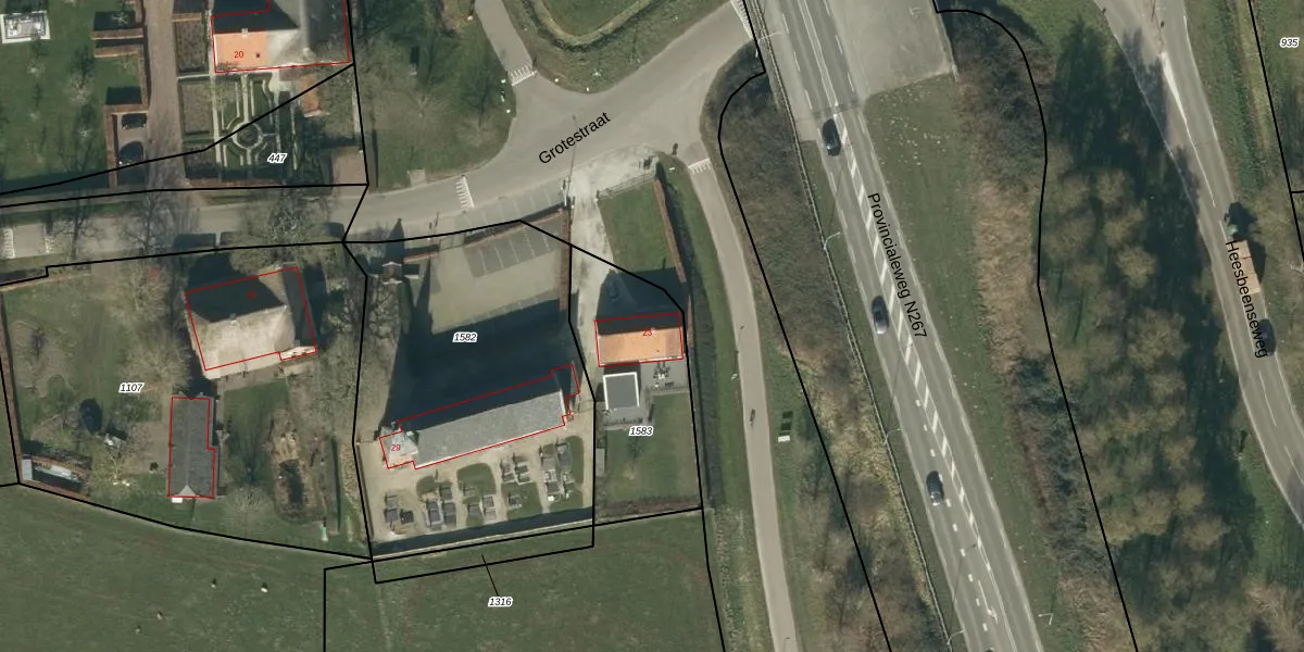 Het perceel waarop Grotestraat 23 staat heeft een oppervlakte van 615 m². Dit is een groot perceel. De perceeloppervlakte wordt geregistreerd door het Kadaster. Gedetailleerde informatie over de maten van dit perceel kunt u vinden in het rapport Kadastrale kaart met maatvoering van Grotestraat 23.