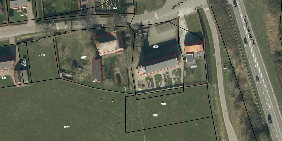Het perceel waarop Grotestraat 29 staat heeft een oppervlakte van 1655 m². Dit is een zeer groot perceel. De perceeloppervlakte wordt geregistreerd door het Kadaster. Gedetailleerde informatie over de maten van dit perceel kunt u vinden in het rapport Kadastrale kaart met maatvoering van Grotestraat 29.