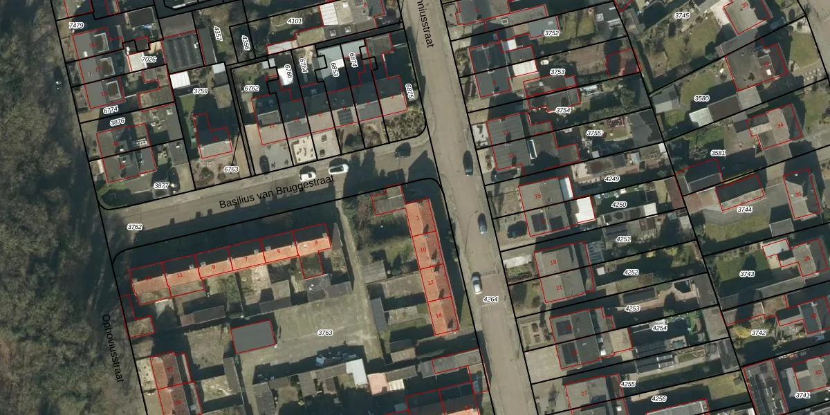 Basilius van Bruggestraat 1 is gelegen op kadastraal perceel HEE02B3763. Deze kadastrale aanduiding is uniek en wordt gebruikt door het Kadaster om eigendomsrechten en andere zakelijke rechten vast te leggen. Het perceel maakt onderdeel uit van de kadastrale gemeente Heesch.