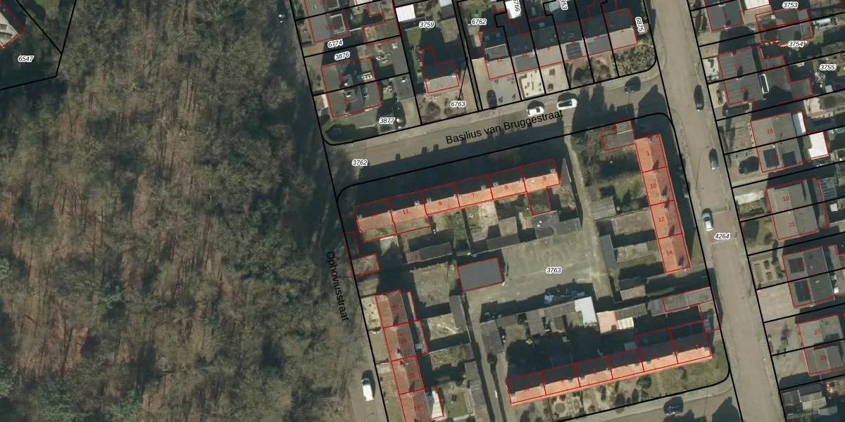 Het perceel waarop Basilius van Bruggestraat 37 staat heeft een oppervlakte van 5380 m². Dit is een zeer groot perceel. De perceeloppervlakte wordt geregistreerd door het Kadaster. Gedetailleerde informatie over de maten van dit perceel kunt u vinden in het rapport Kadastrale kaart met maatvoering van Basilius van Bruggestraat 37.