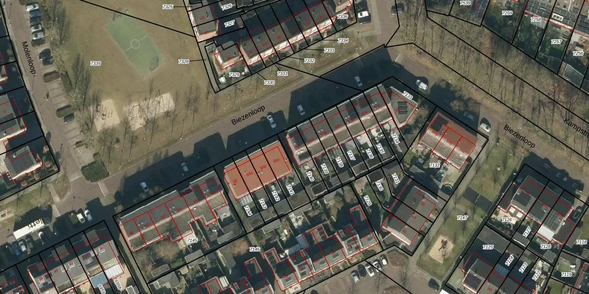Het perceel waarop Biezenloop 62 staat heeft een oppervlakte van 180 m². Dit is een middelgroot perceel. De perceeloppervlakte wordt geregistreerd door het Kadaster. Gedetailleerde informatie over de maten van dit perceel kunt u vinden in het rapport Kadastrale kaart met maatvoering van Biezenloop 62.