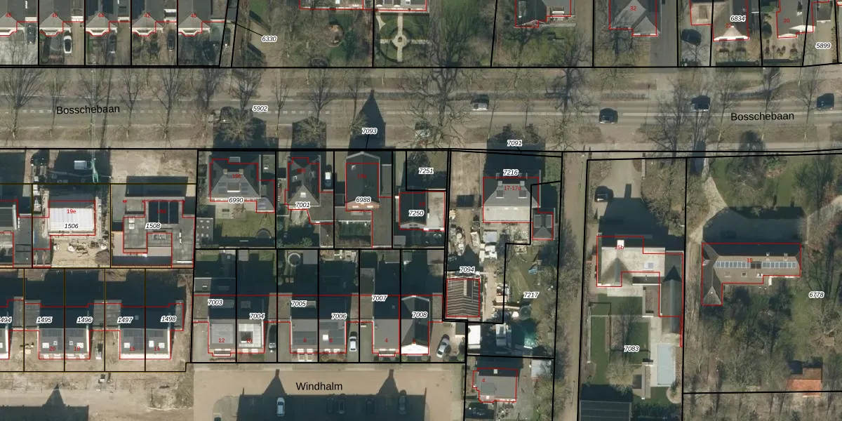 Bosschebaan 19 is gelegen op kadastraal perceel HEE02A7250. Deze kadastrale aanduiding is uniek en wordt gebruikt door het Kadaster om eigendomsrechten en andere zakelijke rechten vast te leggen. Het perceel maakt onderdeel uit van de kadastrale gemeente Heesch.