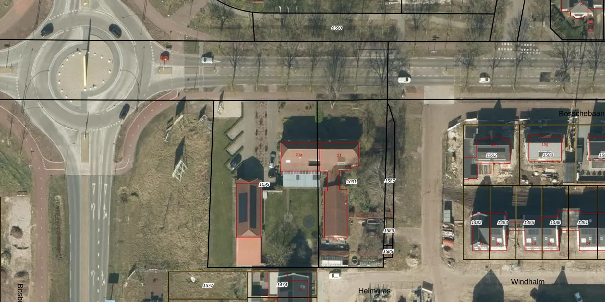 Het perceel waarop Bosschebaan 21-a staat heeft een oppervlakte van 1965 m². Dit is een zeer groot perceel. De perceeloppervlakte wordt geregistreerd door het Kadaster. Gedetailleerde informatie over de maten van dit perceel kunt u vinden in het rapport Kadastrale kaart met maatvoering van Bosschebaan 21-a.