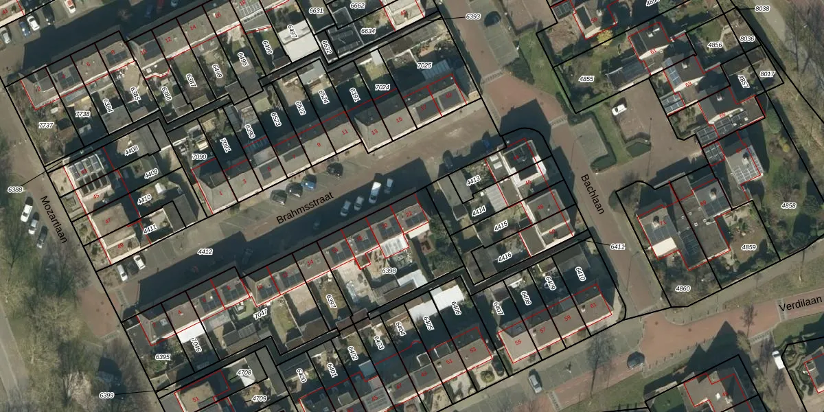Het perceel waarop Brahmsstraat 22 staat heeft een oppervlakte van 638 m². Dit is een groot perceel. De perceeloppervlakte wordt geregistreerd door het Kadaster. Gedetailleerde informatie over de maten van dit perceel kunt u vinden in het rapport Kadastrale kaart met maatvoering van Brahmsstraat 22.