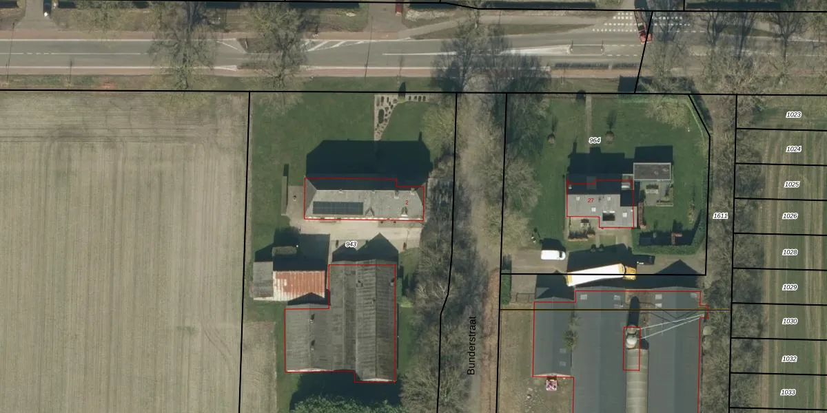 Het perceel waarop Bunderstraat 2 staat heeft een oppervlakte van 3990 m². Dit is een zeer groot perceel. De perceeloppervlakte wordt geregistreerd door het Kadaster. Gedetailleerde informatie over de maten van dit perceel kunt u vinden in het rapport Kadastrale kaart met maatvoering van Bunderstraat 2.