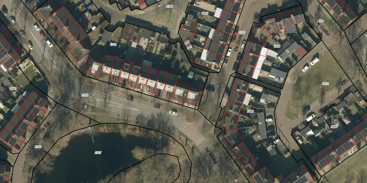 Het perceel waarop De Ploeg 47 staat heeft een oppervlakte van 2972 m². Dit is een zeer groot perceel. De perceeloppervlakte wordt geregistreerd door het Kadaster. Gedetailleerde informatie over de maten van dit perceel kunt u vinden in het rapport Kadastrale kaart met maatvoering van De Ploeg 47.