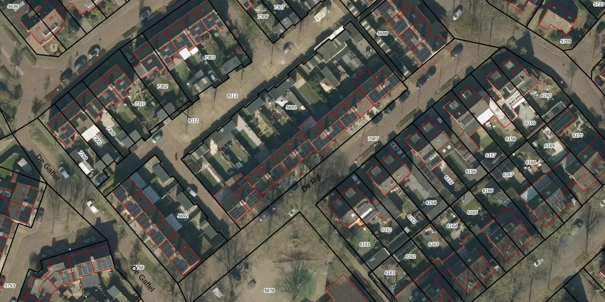 Het perceel waarop De Rijf 11 staat heeft een oppervlakte van 2142 m². Dit is een zeer groot perceel. De perceeloppervlakte wordt geregistreerd door het Kadaster. Gedetailleerde informatie over de maten van dit perceel kunt u vinden in het rapport Kadastrale kaart met maatvoering van De Rijf 11.