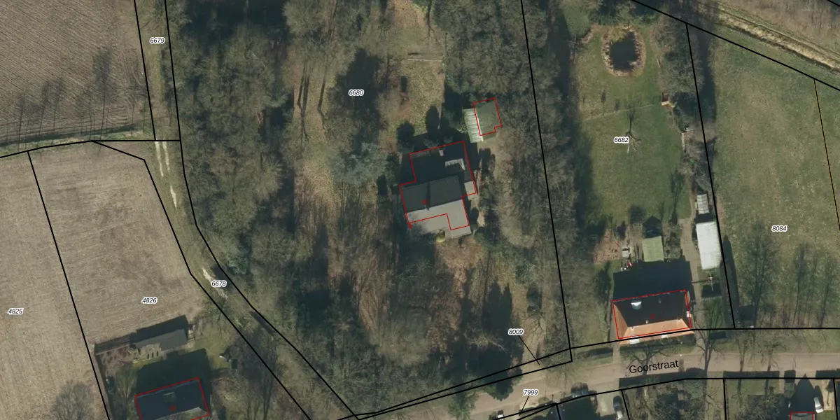 Het perceel waarop Goorstraat 25 staat heeft een oppervlakte van 9766 m². Dit is een zeer groot perceel. De perceeloppervlakte wordt geregistreerd door het Kadaster. Gedetailleerde informatie over de maten van dit perceel kunt u vinden in het rapport Kadastrale kaart met maatvoering van Goorstraat 25.