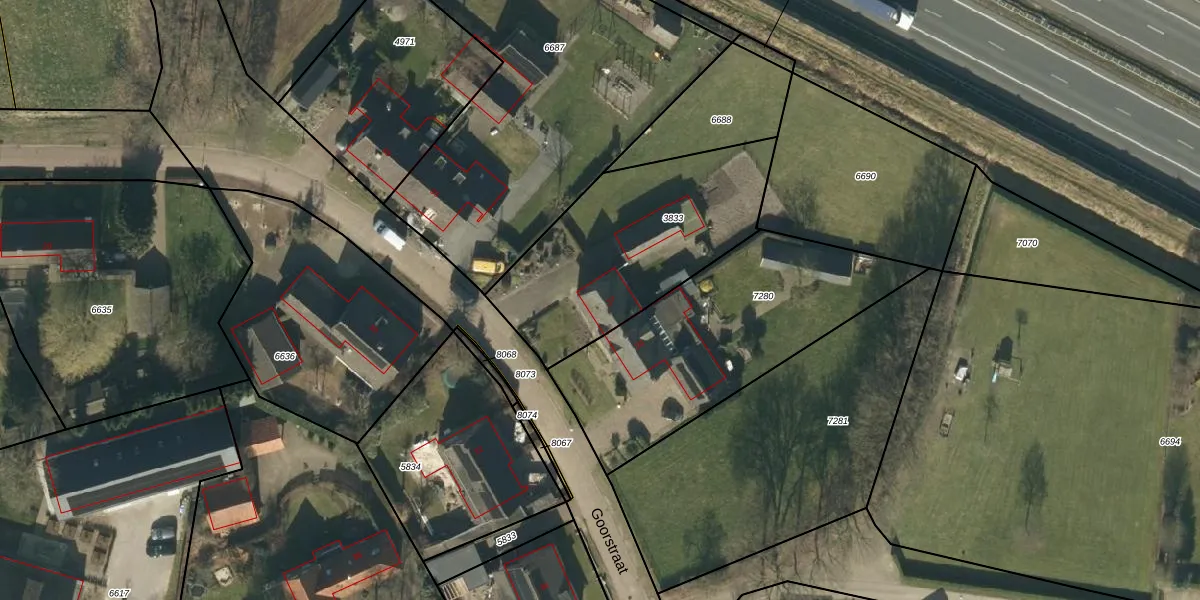 Het perceel waarop Goorstraat 37 staat heeft een oppervlakte van 960 m². Dit is een groot perceel. De perceeloppervlakte wordt geregistreerd door het Kadaster. Gedetailleerde informatie over de maten van dit perceel kunt u vinden in het rapport Kadastrale kaart met maatvoering van Goorstraat 37.