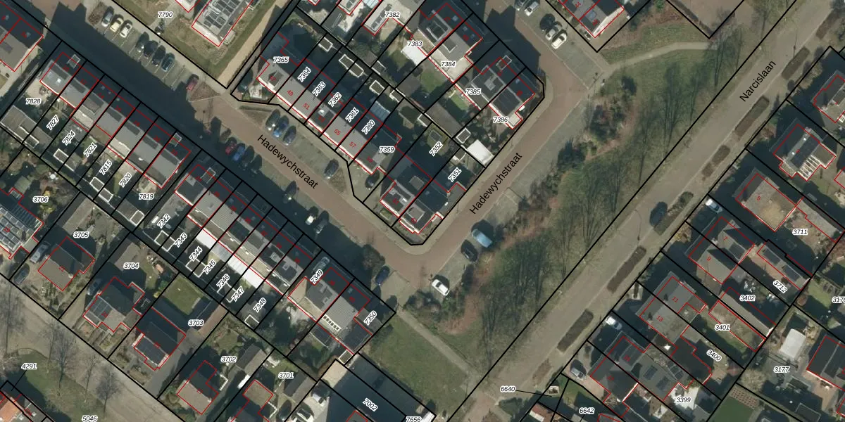 Hadewychstraat 63 is gelegen op kadastraal perceel HEE02B7351. Deze kadastrale aanduiding is uniek en wordt gebruikt door het Kadaster om eigendomsrechten en andere zakelijke rechten vast te leggen. Het perceel maakt onderdeel uit van de kadastrale gemeente Heesch.