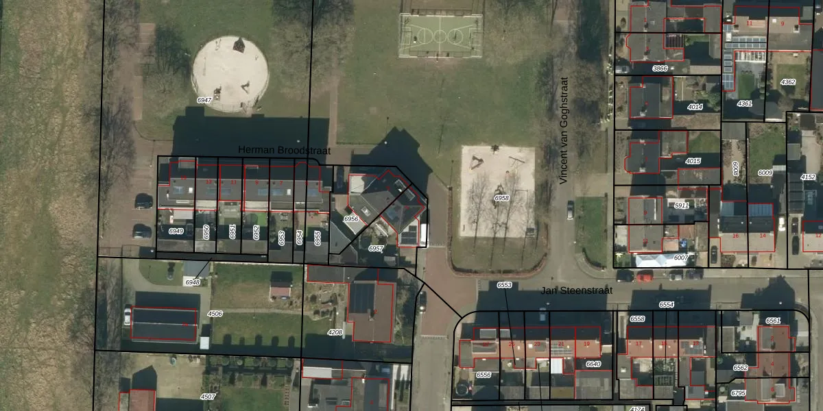 Herman Broodstraat 1 is gelegen op kadastraal perceel HEE02A6957. Deze kadastrale aanduiding is uniek en wordt gebruikt door het Kadaster om eigendomsrechten en andere zakelijke rechten vast te leggen. Het perceel maakt onderdeel uit van de kadastrale gemeente Heesch.