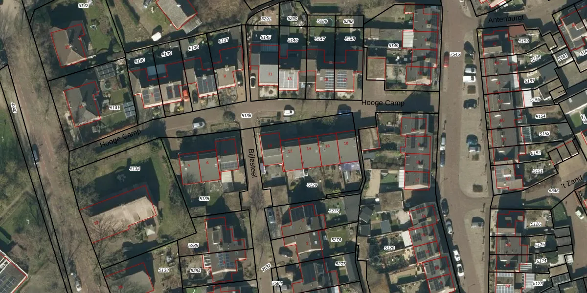 Het perceel waarop Hooge Camp 12 staat heeft een oppervlakte van 910 m². Dit is een groot perceel. De perceeloppervlakte wordt geregistreerd door het Kadaster. Gedetailleerde informatie over de maten van dit perceel kunt u vinden in het rapport Kadastrale kaart met maatvoering van Hooge Camp 12.