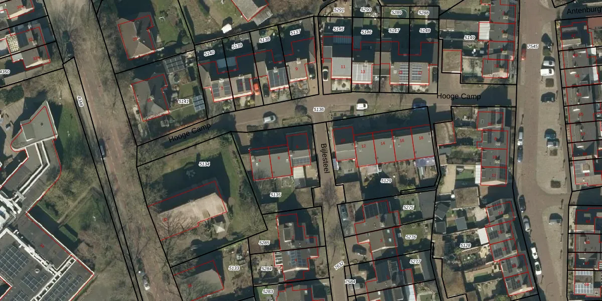 Het perceel waarop Hooge Camp 8 staat heeft een oppervlakte van 638 m². Dit is een groot perceel. De perceeloppervlakte wordt geregistreerd door het Kadaster. Gedetailleerde informatie over de maten van dit perceel kunt u vinden in het rapport Kadastrale kaart met maatvoering van Hooge Camp 8.