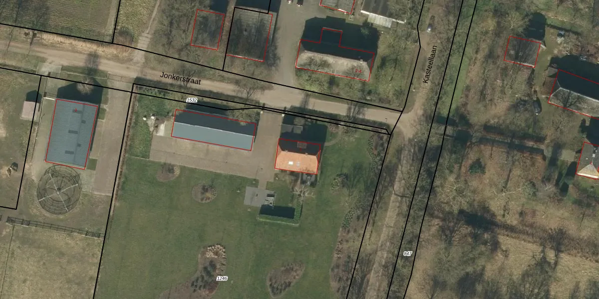 Het perceel waarop Jonkerstraat 1 staat heeft een oppervlakte van 8955 m². Dit is een zeer groot perceel. De perceeloppervlakte wordt geregistreerd door het Kadaster. Gedetailleerde informatie over de maten van dit perceel kunt u vinden in het rapport Kadastrale kaart met maatvoering van Jonkerstraat 1.