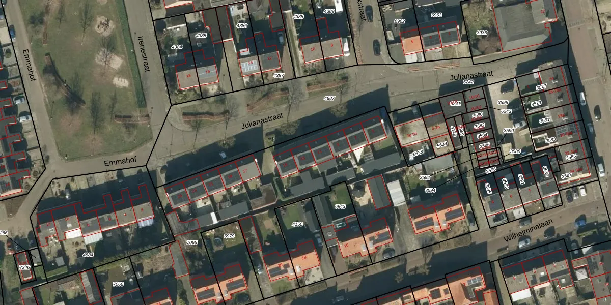 Het perceel waarop Julianastraat 13 staat heeft een oppervlakte van 3565 m². Dit is een zeer groot perceel. De perceeloppervlakte wordt geregistreerd door het Kadaster. Gedetailleerde informatie over de maten van dit perceel kunt u vinden in het rapport Kadastrale kaart met maatvoering van Julianastraat 13.