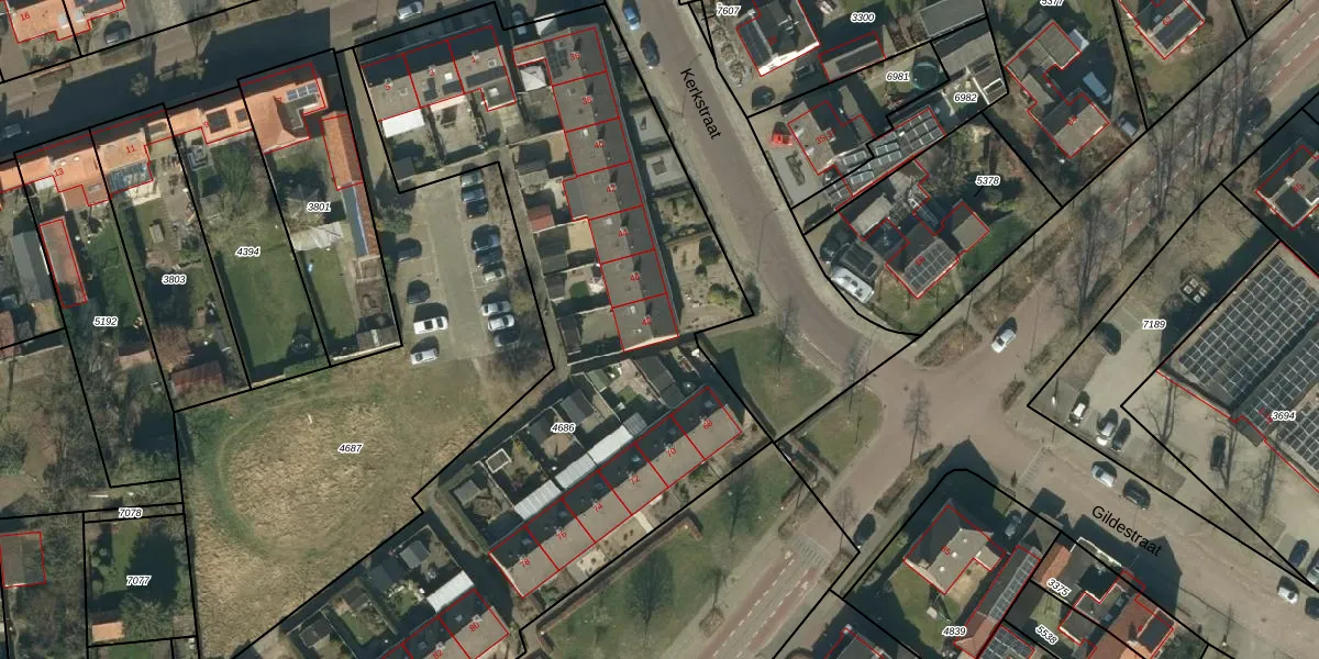 Het perceel waarop Kerkstraat 48 staat heeft een oppervlakte van 4350 m². Dit is een zeer groot perceel. De perceeloppervlakte wordt geregistreerd door het Kadaster. Gedetailleerde informatie over de maten van dit perceel kunt u vinden in het rapport Kadastrale kaart met maatvoering van Kerkstraat 48.