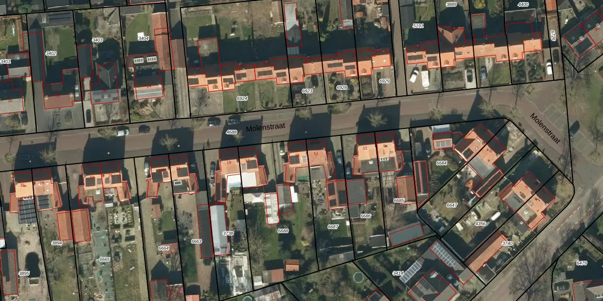 Het perceel waarop Molenstraat 15 staat heeft een oppervlakte van 1039 m². Dit is een zeer groot perceel. De perceeloppervlakte wordt geregistreerd door het Kadaster. Gedetailleerde informatie over de maten van dit perceel kunt u vinden in het rapport Kadastrale kaart met maatvoering van Molenstraat 15.