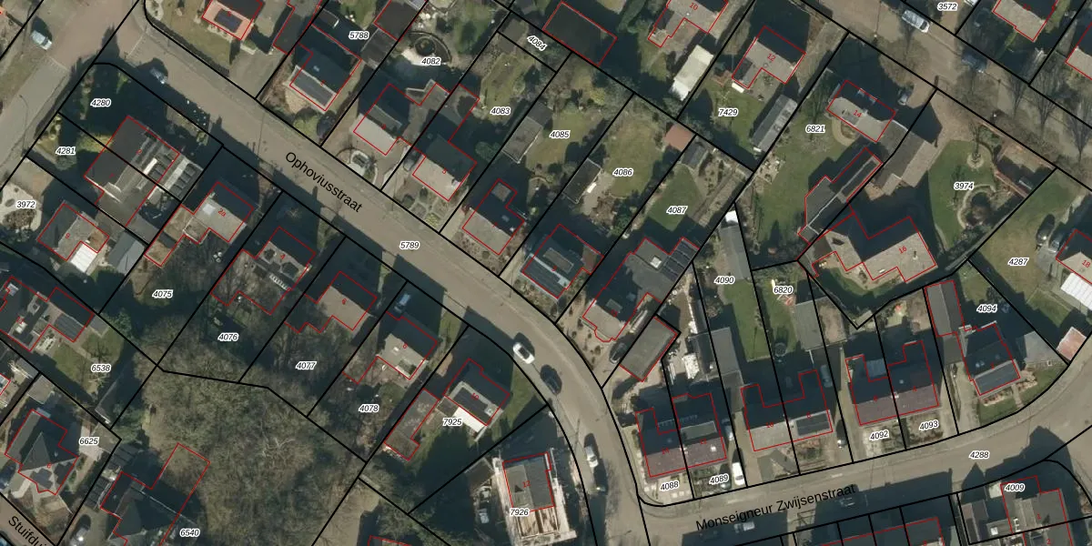 Het perceel waarop Ophoviusstraat 9 staat heeft een oppervlakte van 581 m². Dit is een groot perceel. De perceeloppervlakte wordt geregistreerd door het Kadaster. Gedetailleerde informatie over de maten van dit perceel kunt u vinden in het rapport Kadastrale kaart met maatvoering van Ophoviusstraat 9.