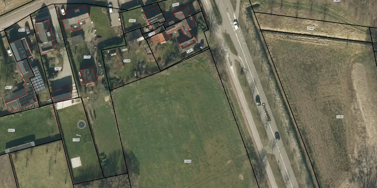 Het perceel waarop Osseweg 23-h staat heeft een oppervlakte van 6012 m². Dit is een zeer groot perceel. De perceeloppervlakte wordt geregistreerd door het Kadaster. Gedetailleerde informatie over de maten van dit perceel kunt u vinden in het rapport Kadastrale kaart met maatvoering van Osseweg 23-h.