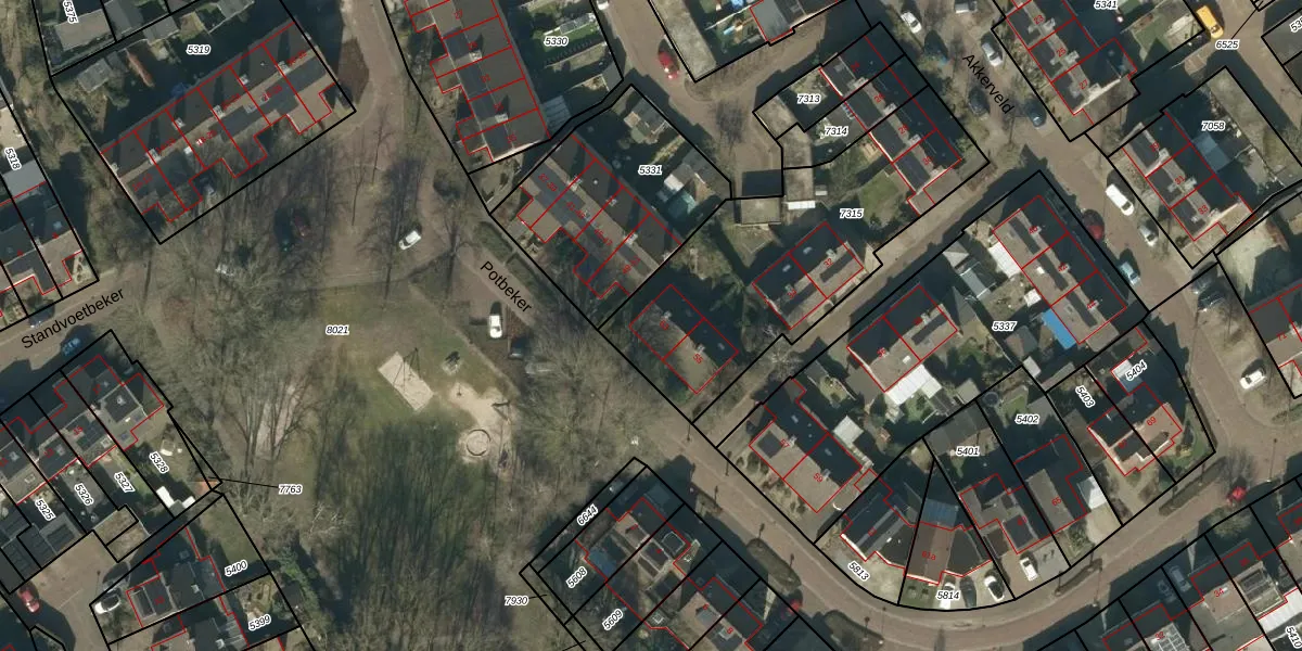 Het perceel waarop Potbeker 53 staat heeft een oppervlakte van 1174 m². Dit is een zeer groot perceel. De perceeloppervlakte wordt geregistreerd door het Kadaster. Gedetailleerde informatie over de maten van dit perceel kunt u vinden in het rapport Kadastrale kaart met maatvoering van Potbeker 53.