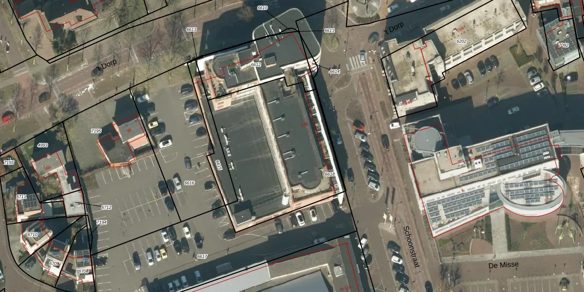 Het perceel waarop Schoonstraat 4-n staat heeft een oppervlakte van 1618 m². Dit is een zeer groot perceel. De perceeloppervlakte wordt geregistreerd door het Kadaster. Gedetailleerde informatie over de maten van dit perceel kunt u vinden in het rapport Kadastrale kaart met maatvoering van Schoonstraat 4-n.