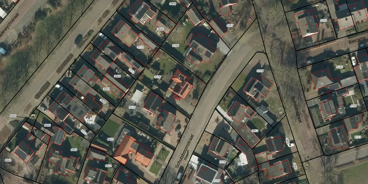 Het perceel waarop Schutsboomstraat 4 staat heeft een oppervlakte van 715 m². Dit is een groot perceel. De perceeloppervlakte wordt geregistreerd door het Kadaster. Gedetailleerde informatie over de maten van dit perceel kunt u vinden in het rapport Kadastrale kaart met maatvoering van Schutsboomstraat 4.