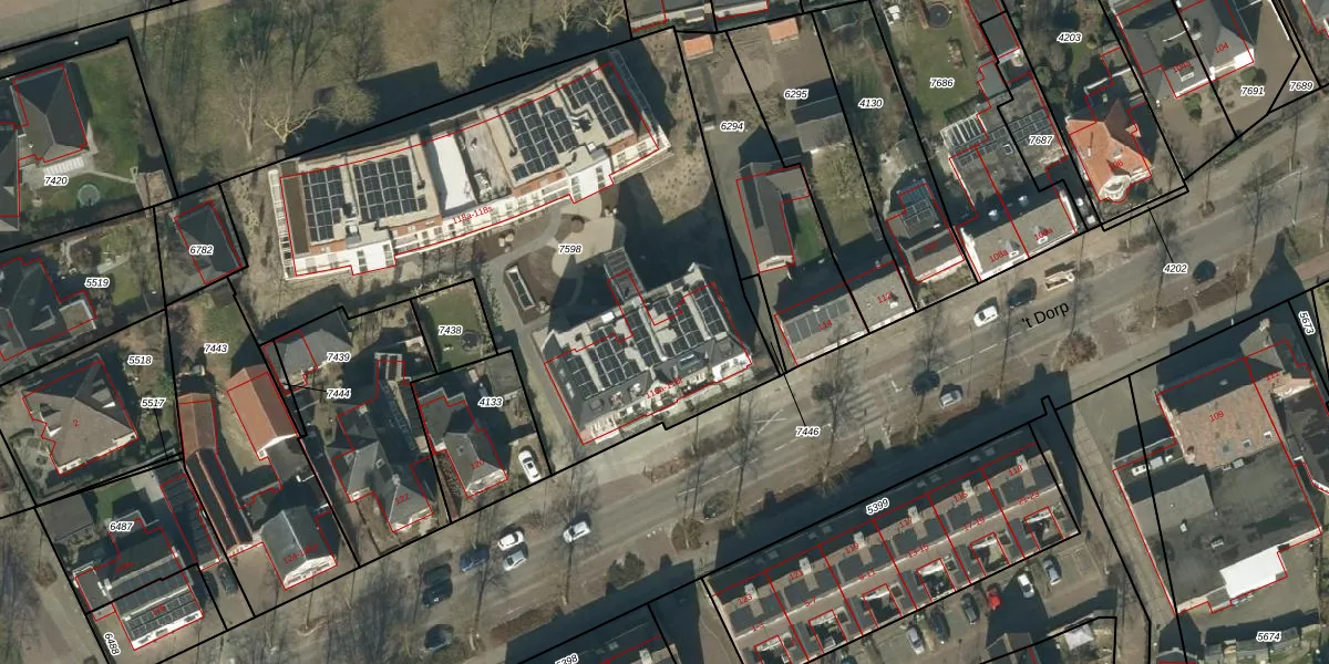 Het perceel waarop 't Dorp 116-j staat heeft een oppervlakte van 3038 m². Dit is een zeer groot perceel. De perceeloppervlakte wordt geregistreerd door het Kadaster. Gedetailleerde informatie over de maten van dit perceel kunt u vinden in het rapport Kadastrale kaart met maatvoering van 't Dorp 116-j.