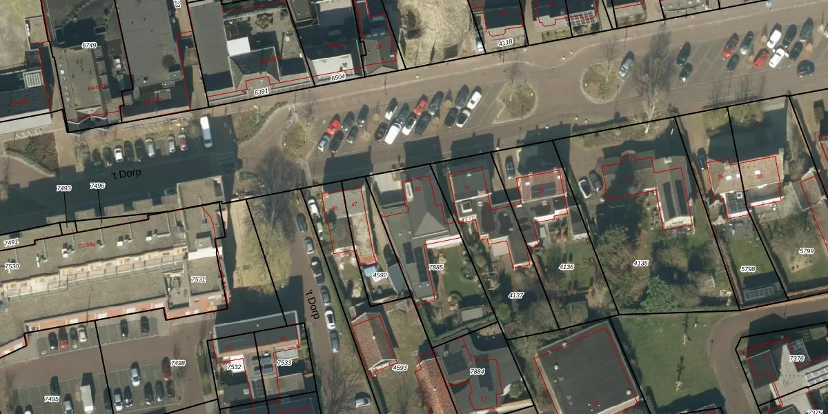 Het perceel waarop 't Dorp 43 staat heeft een oppervlakte van 700 m². Dit is een groot perceel. De perceeloppervlakte wordt geregistreerd door het Kadaster. Gedetailleerde informatie over de maten van dit perceel kunt u vinden in het rapport Kadastrale kaart met maatvoering van 't Dorp 43.