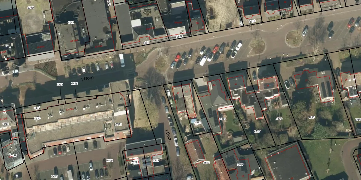 Het perceel waarop 't Dorp 45 staat heeft een oppervlakte van 834 m². Dit is een groot perceel. De perceeloppervlakte wordt geregistreerd door het Kadaster. Gedetailleerde informatie over de maten van dit perceel kunt u vinden in het rapport Kadastrale kaart met maatvoering van 't Dorp 45.