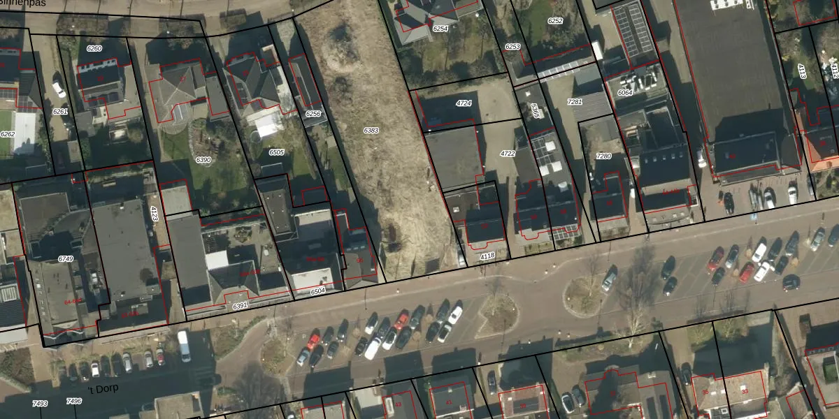 Het perceel waarop 't Dorp 54-e staat heeft een oppervlakte van 1382 m². Dit is een zeer groot perceel. De perceeloppervlakte wordt geregistreerd door het Kadaster. Gedetailleerde informatie over de maten van dit perceel kunt u vinden in het rapport Kadastrale kaart met maatvoering van 't Dorp 54-e.