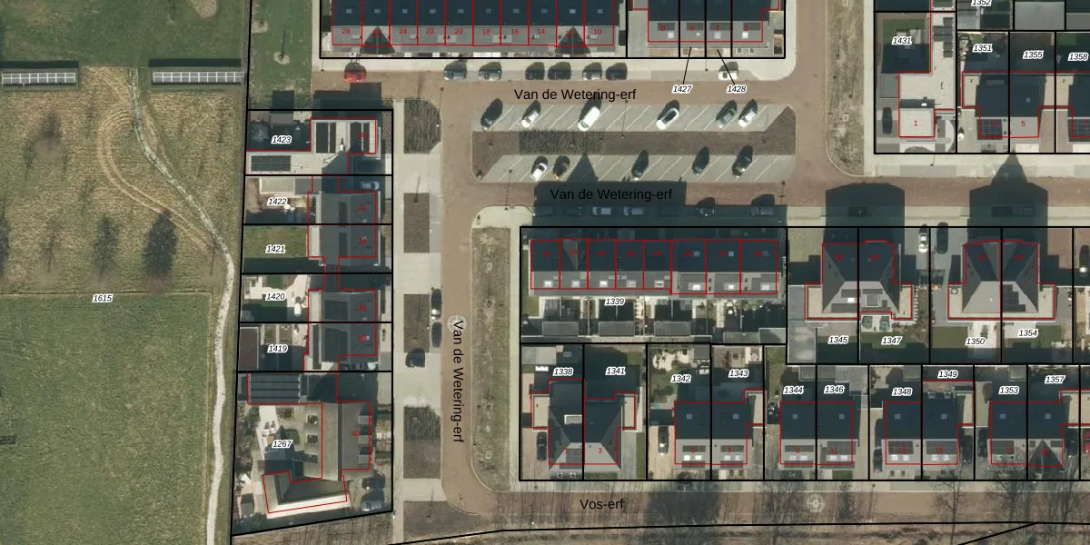 Het perceel waarop Van de Wetering-erf 42 staat heeft een oppervlakte van 1045 m². Dit is een zeer groot perceel. De perceeloppervlakte wordt geregistreerd door het Kadaster. Gedetailleerde informatie over de maten van dit perceel kunt u vinden in het rapport Kadastrale kaart met maatvoering van Van de Wetering-erf 42.