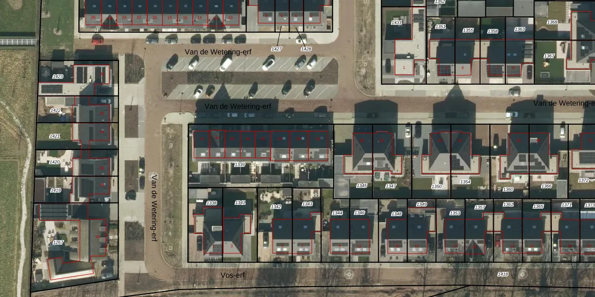 Het perceel waarop Van de Wetering-erf 54 staat heeft een oppervlakte van 1045 m². Dit is een zeer groot perceel. De perceeloppervlakte wordt geregistreerd door het Kadaster. Gedetailleerde informatie over de maten van dit perceel kunt u vinden in het rapport Kadastrale kaart met maatvoering van Van de Wetering-erf 54.