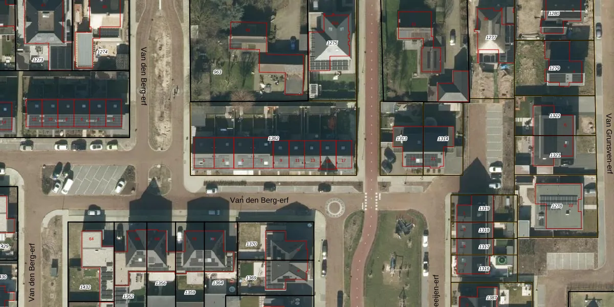 Van den Berg-erf 13 is gelegen op kadastraal perceel HEE02F1362. Deze kadastrale aanduiding is uniek en wordt gebruikt door het Kadaster om eigendomsrechten en andere zakelijke rechten vast te leggen. Het perceel maakt onderdeel uit van de kadastrale gemeente Heesch.