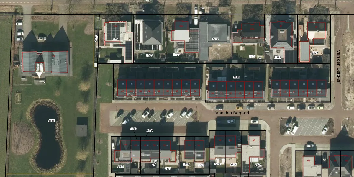 Het perceel waarop Van den Berg-erf 30 staat heeft een oppervlakte van 2605 m². Dit is een zeer groot perceel. De perceeloppervlakte wordt geregistreerd door het Kadaster. Gedetailleerde informatie over de maten van dit perceel kunt u vinden in het rapport Kadastrale kaart met maatvoering van Van den Berg-erf 30.