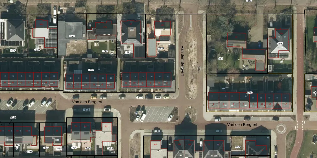 Het perceel waarop Van den Berg-erf 4 staat heeft een oppervlakte van 2605 m². Dit is een zeer groot perceel. De perceeloppervlakte wordt geregistreerd door het Kadaster. Gedetailleerde informatie over de maten van dit perceel kunt u vinden in het rapport Kadastrale kaart met maatvoering van Van den Berg-erf 4.