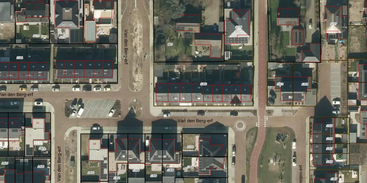 Het perceel waarop Van den Berg-erf 5 staat heeft een oppervlakte van 1311 m². Dit is een zeer groot perceel. De perceeloppervlakte wordt geregistreerd door het Kadaster. Gedetailleerde informatie over de maten van dit perceel kunt u vinden in het rapport Kadastrale kaart met maatvoering van Van den Berg-erf 5.