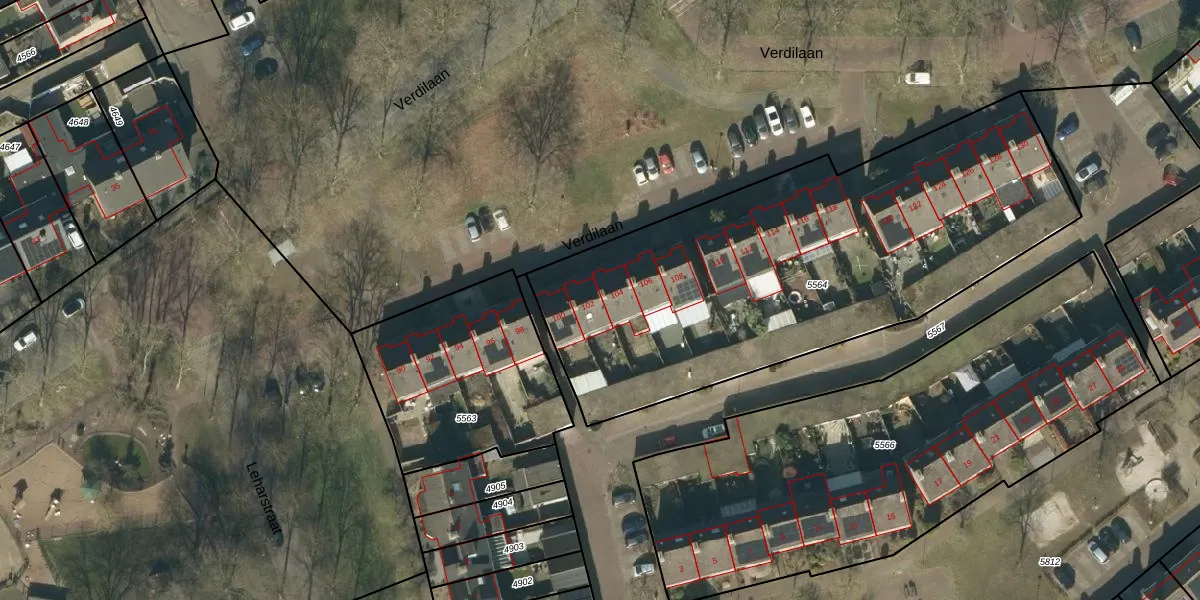 Het perceel waarop Verdilaan 102 staat heeft een oppervlakte van 2449 m². Dit is een zeer groot perceel. De perceeloppervlakte wordt geregistreerd door het Kadaster. Gedetailleerde informatie over de maten van dit perceel kunt u vinden in het rapport Kadastrale kaart met maatvoering van Verdilaan 102.