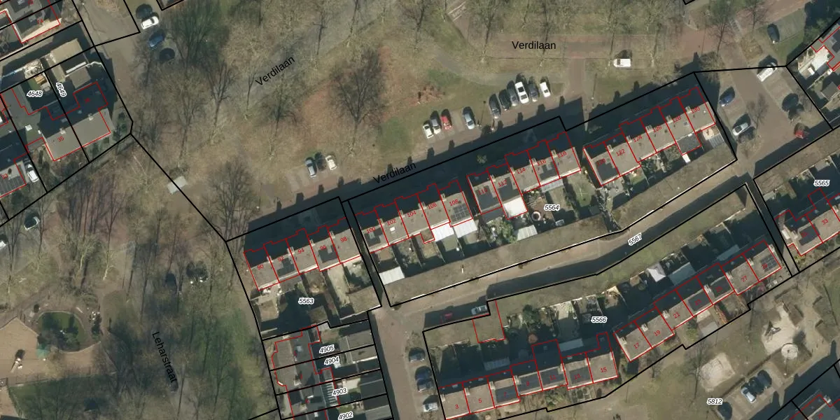 Het perceel waarop Verdilaan 104 staat heeft een oppervlakte van 2449 m². Dit is een zeer groot perceel. De perceeloppervlakte wordt geregistreerd door het Kadaster. Gedetailleerde informatie over de maten van dit perceel kunt u vinden in het rapport Kadastrale kaart met maatvoering van Verdilaan 104.