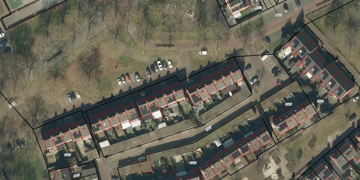 Het perceel waarop Verdilaan 118 staat heeft een oppervlakte van 2449 m². Dit is een zeer groot perceel. De perceeloppervlakte wordt geregistreerd door het Kadaster. Gedetailleerde informatie over de maten van dit perceel kunt u vinden in het rapport Kadastrale kaart met maatvoering van Verdilaan 118.