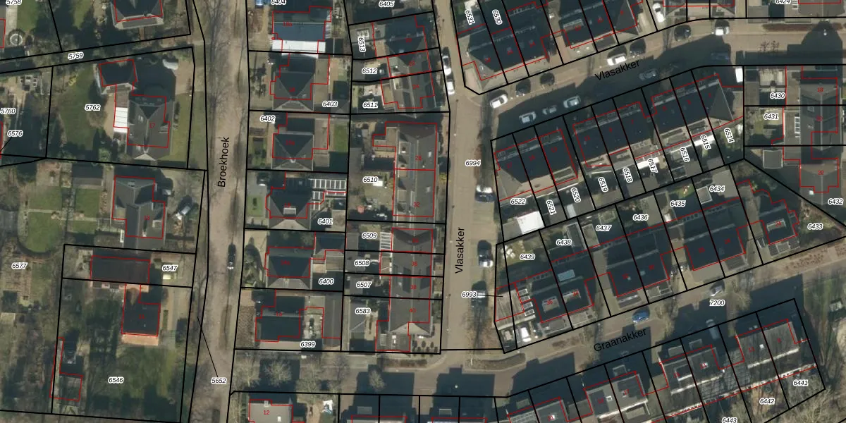 Vlasakker 32 is gelegen op kadastraal perceel HEE02A6510. Deze kadastrale aanduiding is uniek en wordt gebruikt door het Kadaster om eigendomsrechten en andere zakelijke rechten vast te leggen. Het perceel maakt onderdeel uit van de kadastrale gemeente Heesch.