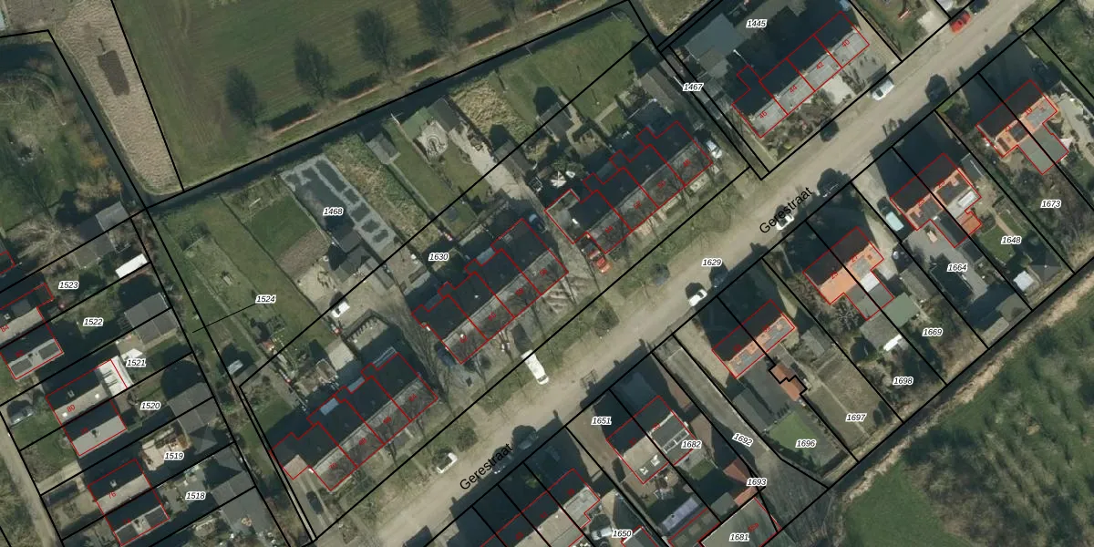 Het perceel waarop Gerestraat 56 staat heeft een oppervlakte van 3117 m². Dit is een zeer groot perceel. De perceeloppervlakte wordt geregistreerd door het Kadaster. Gedetailleerde informatie over de maten van dit perceel kunt u vinden in het rapport Kadastrale kaart met maatvoering van Gerestraat 56.