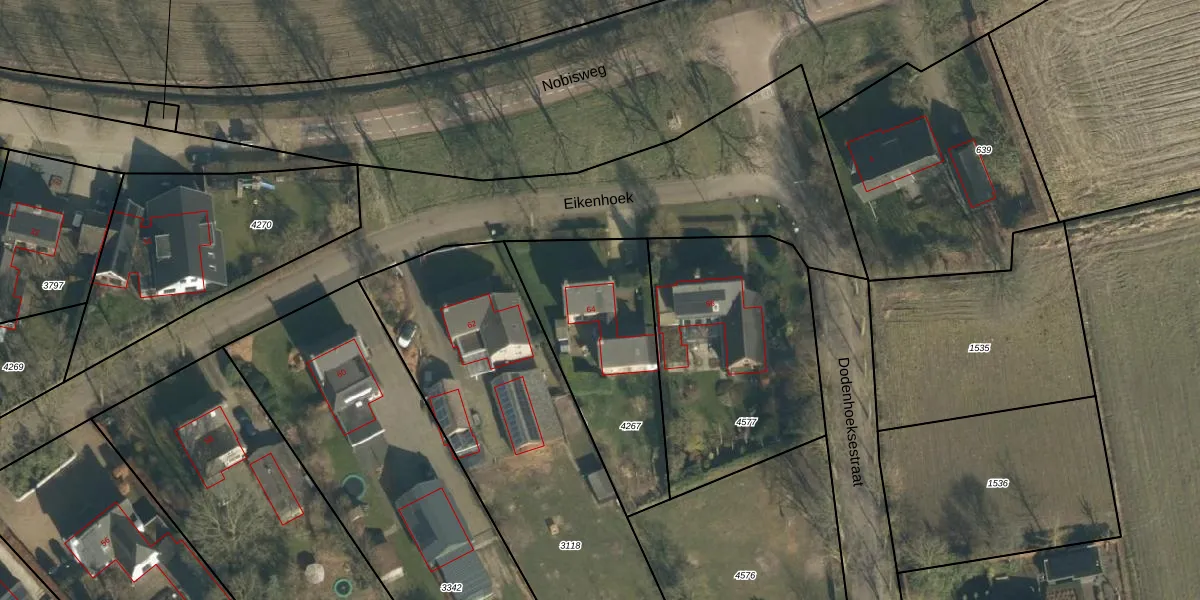 Eikenhoek 64 is gelegen op kadastraal perceel HWK02C4267. Deze kadastrale aanduiding is uniek en wordt gebruikt door het Kadaster om eigendomsrechten en andere zakelijke rechten vast te leggen. Het perceel maakt onderdeel uit van de kadastrale gemeente Heeswijk-Dinther.