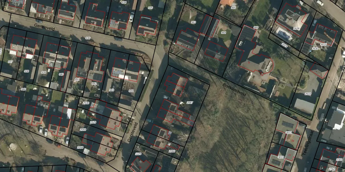 Gersteveld 10 is gelegen op kadastraal perceel HWK02E2067. Deze kadastrale aanduiding is uniek en wordt gebruikt door het Kadaster om eigendomsrechten en andere zakelijke rechten vast te leggen. Het perceel maakt onderdeel uit van de kadastrale gemeente Heeswijk-Dinther.