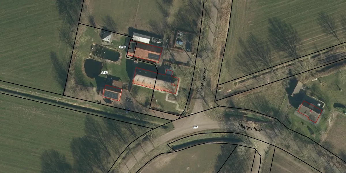 Het perceel waarop Het Schoor 2 staat heeft een oppervlakte van 3803 m². Dit is een zeer groot perceel. De perceeloppervlakte wordt geregistreerd door het Kadaster. Gedetailleerde informatie over de maten van dit perceel kunt u vinden in het rapport Kadastrale kaart met maatvoering van Het Schoor 2.