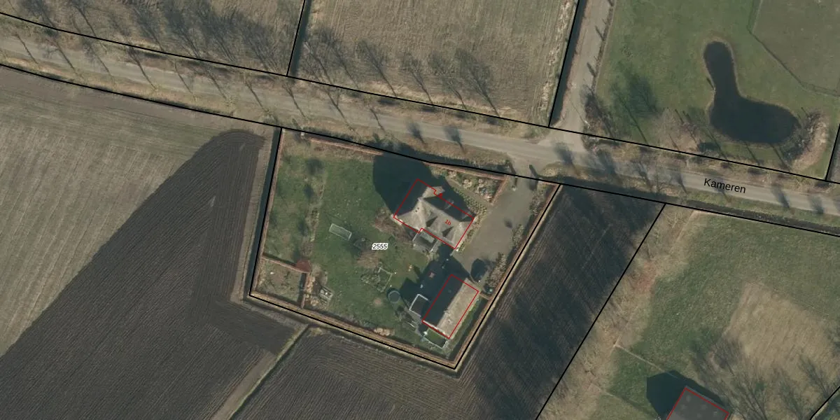 Het perceel waarop Kameren 1-b staat heeft een oppervlakte van 2660 m². Dit is een zeer groot perceel. De perceeloppervlakte wordt geregistreerd door het Kadaster. Gedetailleerde informatie over de maten van dit perceel kunt u vinden in het rapport Kadastrale kaart met maatvoering van Kameren 1-b.