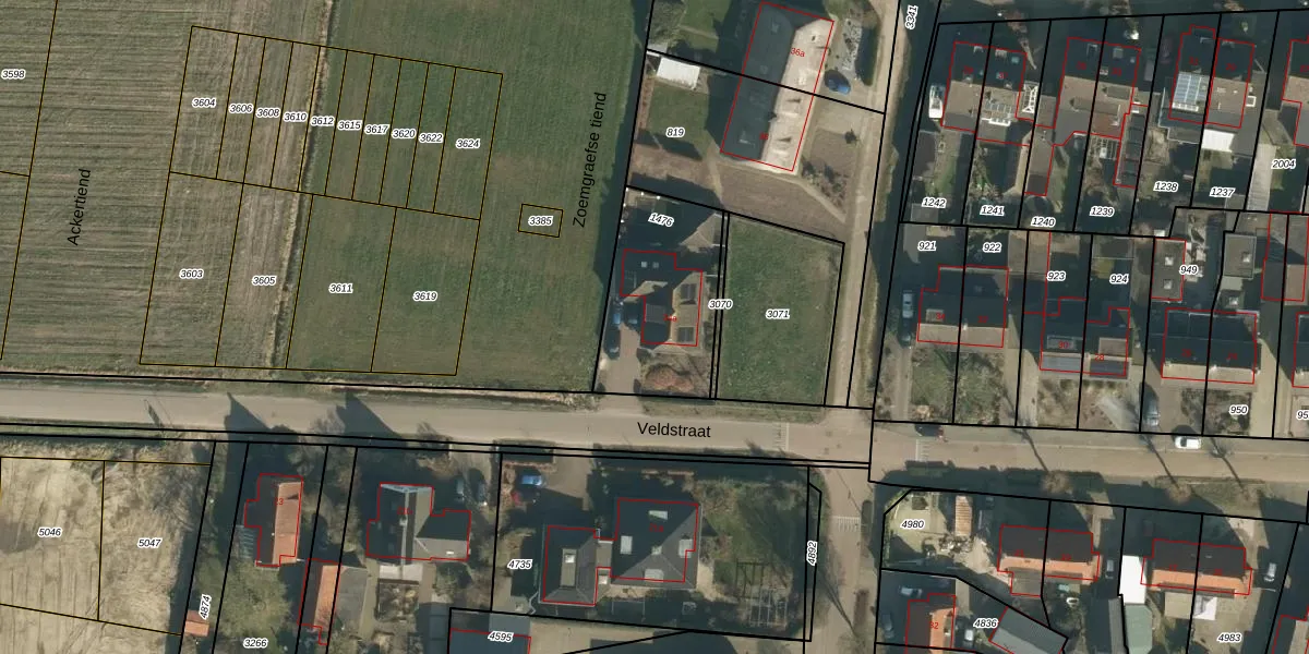 Veldstraat 34-a is gelegen op kadastraal perceel HWK02E1476. Deze kadastrale aanduiding is uniek en wordt gebruikt door het Kadaster om eigendomsrechten en andere zakelijke rechten vast te leggen. Het perceel maakt onderdeel uit van de kadastrale gemeente Heeswijk-Dinther.