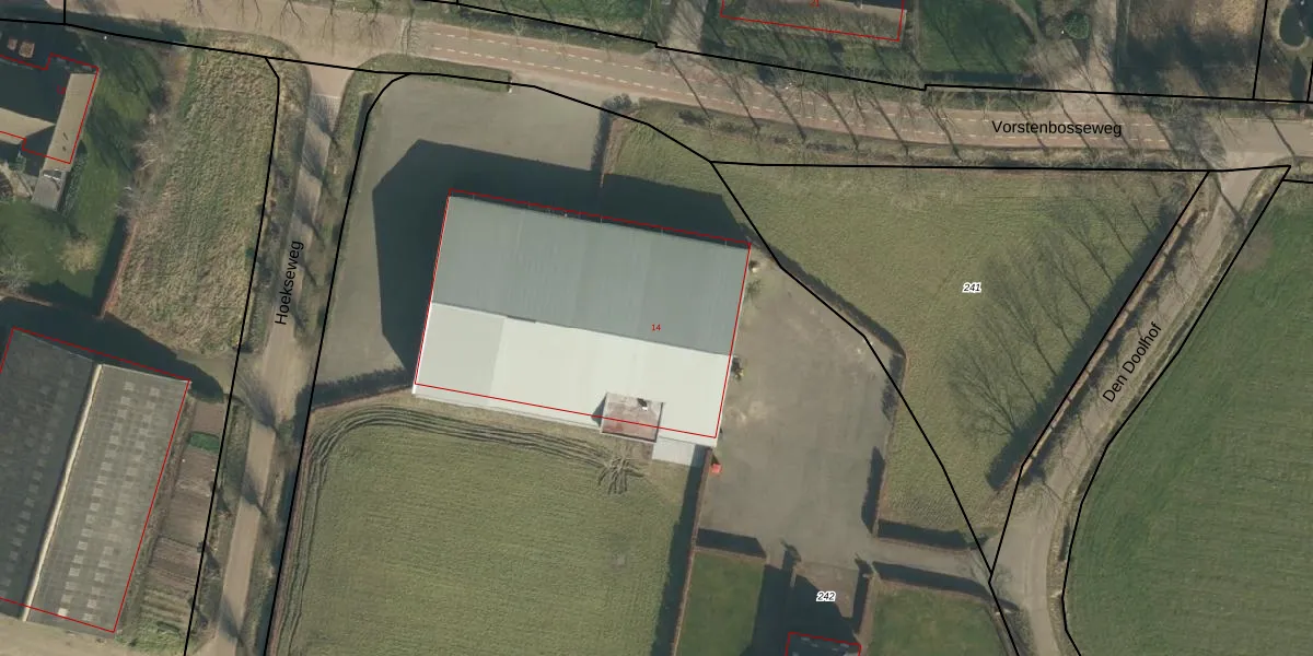 Vorstenbosseweg 14 is gelegen op kadastraal perceel HWK02F242. Deze kadastrale aanduiding is uniek en wordt gebruikt door het Kadaster om eigendomsrechten en andere zakelijke rechten vast te leggen. Het perceel maakt onderdeel uit van de kadastrale gemeente Heeswijk-Dinther.